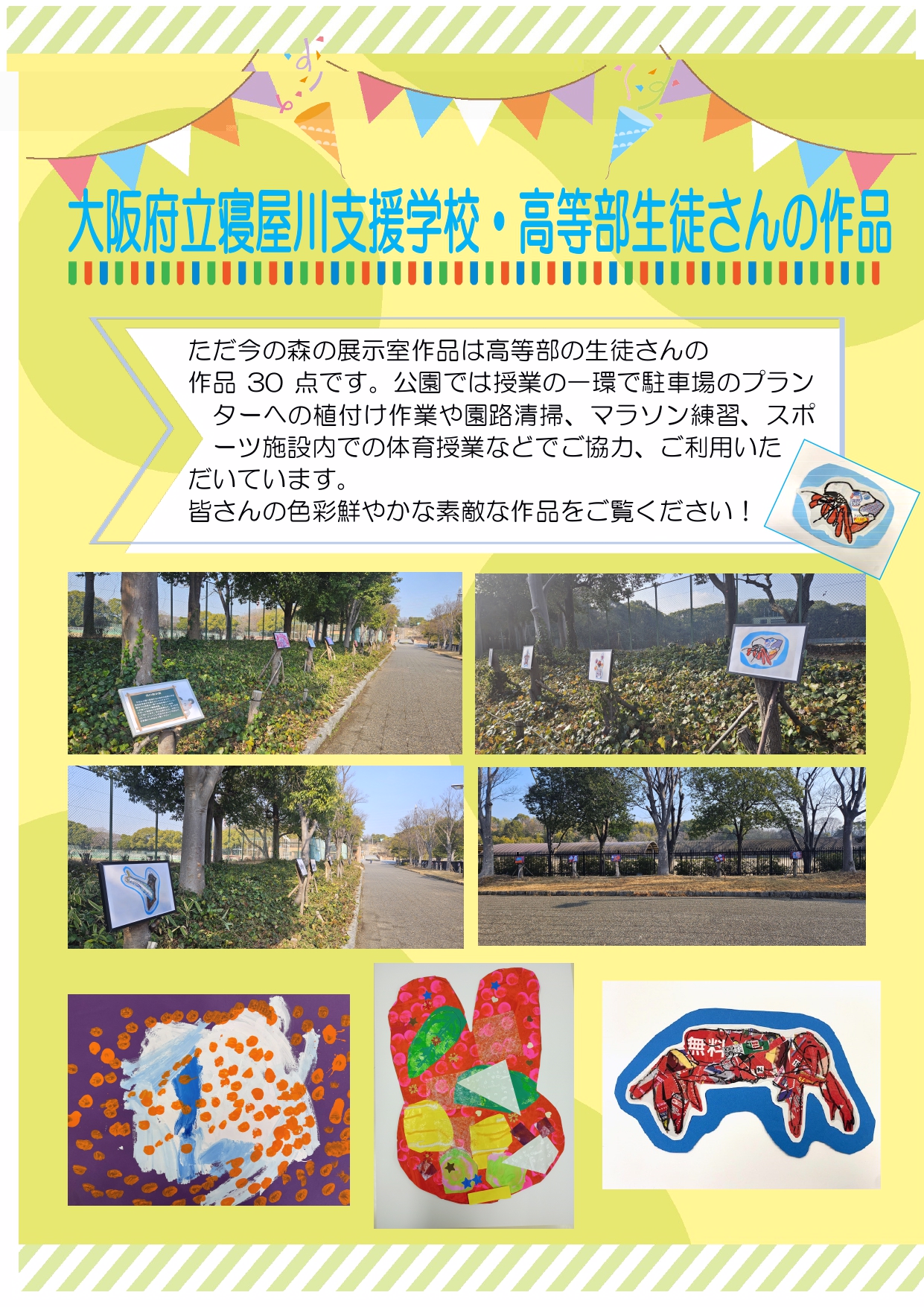 今回は府立寝屋川支援学校の高等部の生徒さんの作品30点です。公園では授業の一環で駐車場のプランターへの花苗の植付け作業や園路清掃、マラソン練習、スポーツ施設内での体育授業などでご協力、ご利用いただいています。皆さんの色彩鮮やかな素敵な作品をご覧ください!